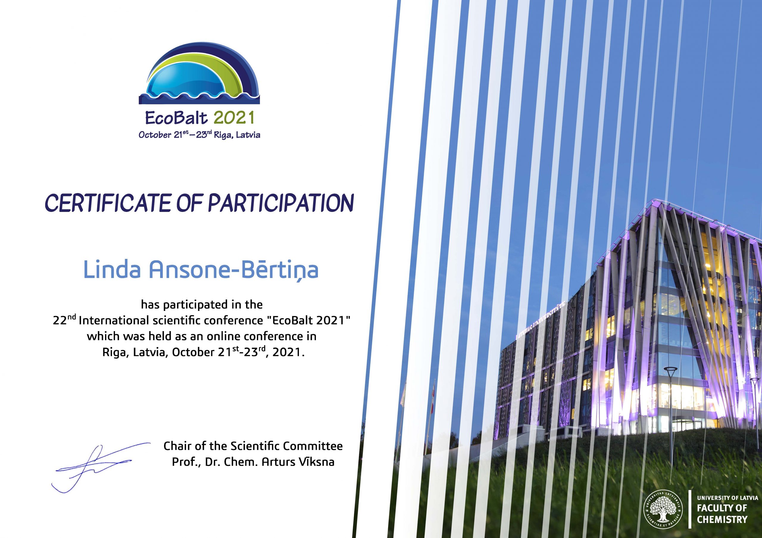 21 starptautiskajā konferencē ECOBALT 21 par projekta rezultātiem ziņojumu sniedza L.Ansone Bērtiņa (līdzautori M.Kļaviņš, L.Arbidans, V.Ozols) par pētījumiem, kas veikti projekta aktivitātes 1.1. un 1.2. ietvaros. Tika demonstrētas oglekļa uztveršanas iespējas un dažādu pētīto materiālu izmantošanas iespējas.