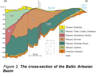 Structures for carbon dioxide storage are within Cambrian sediments in the Baltic Artesian Basin (Figure 2). The Cambrian system in Latvia consists of various sediments of terrigenous origin, such as sandstone, sand, siltstone, clay and argillite. These structures are covered by Ordovician, Silurian, Devonian and Quaternary sediments, and in some places also with Carbon, Permian Triassic, Jurassic and Cretaceous sediments, which act as a natural seal for the gas storage.