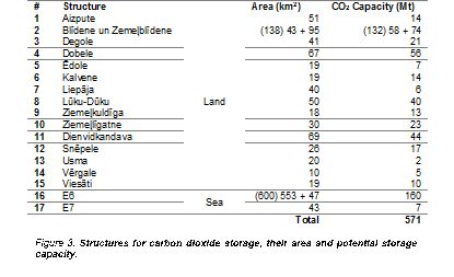 The estimated capacity for carbon dioxide storage in terrestrial structures in Latvia is approximately 404 Mt, while in the Baltic Sea it is around 167 Mt (Figure 3). However, these calculations are based on very general information with low level of detail and thus the actual storage capacity may far exceed this amount – up to 1 000 Mt according to our most optimistic calculations. Thus, the members of this project highly recommend further and more detailed funded research regarding carbon storage in Latvia as this is not only of scientific interest, but also is a cost-effective measure. Detailed and individual studies of underground structures in Latvia are necessary all the more so because Latvia is the only one of the Baltic States, where prospects for carbon dioxide storage in natural underground structures have been localized.